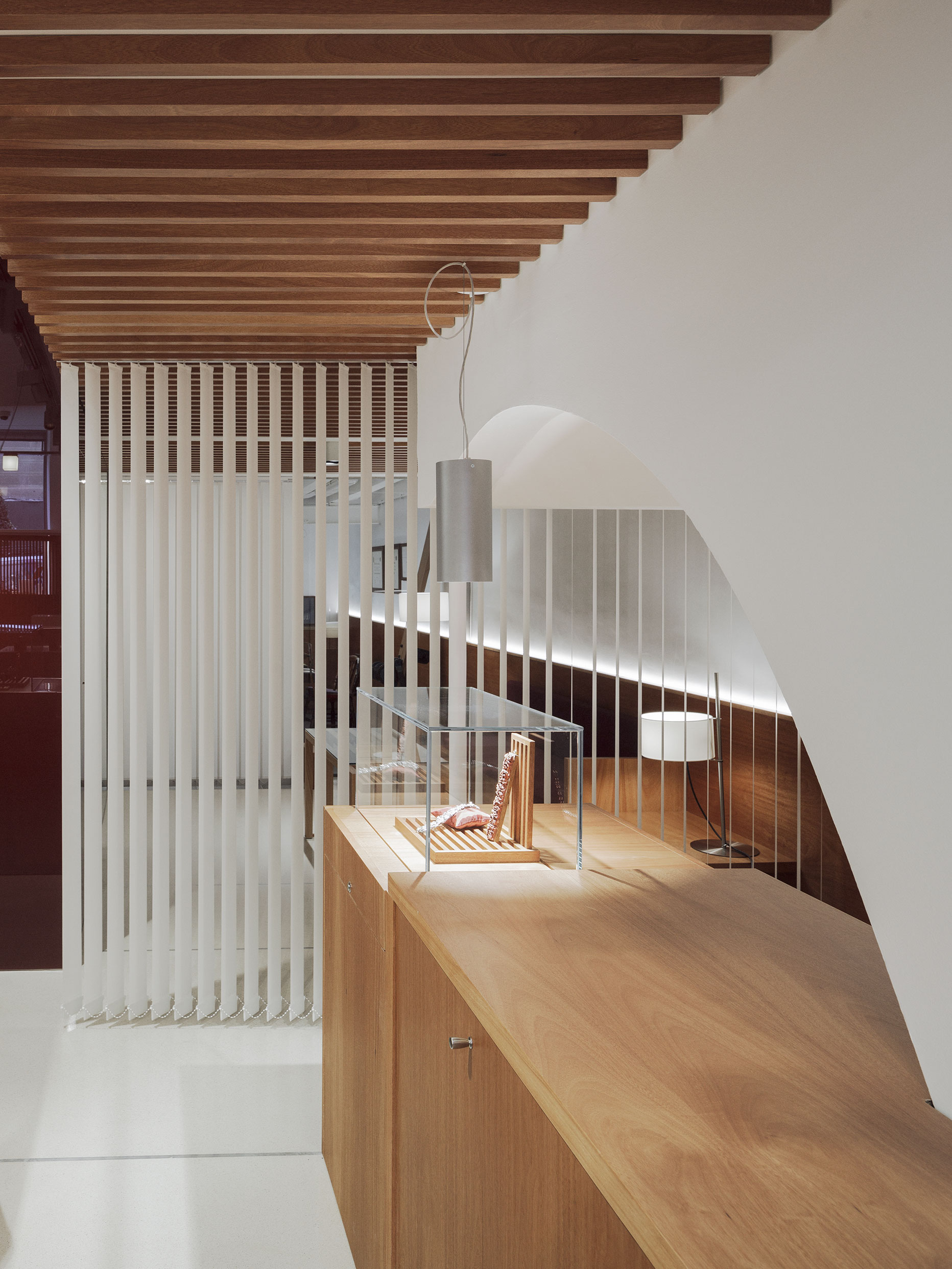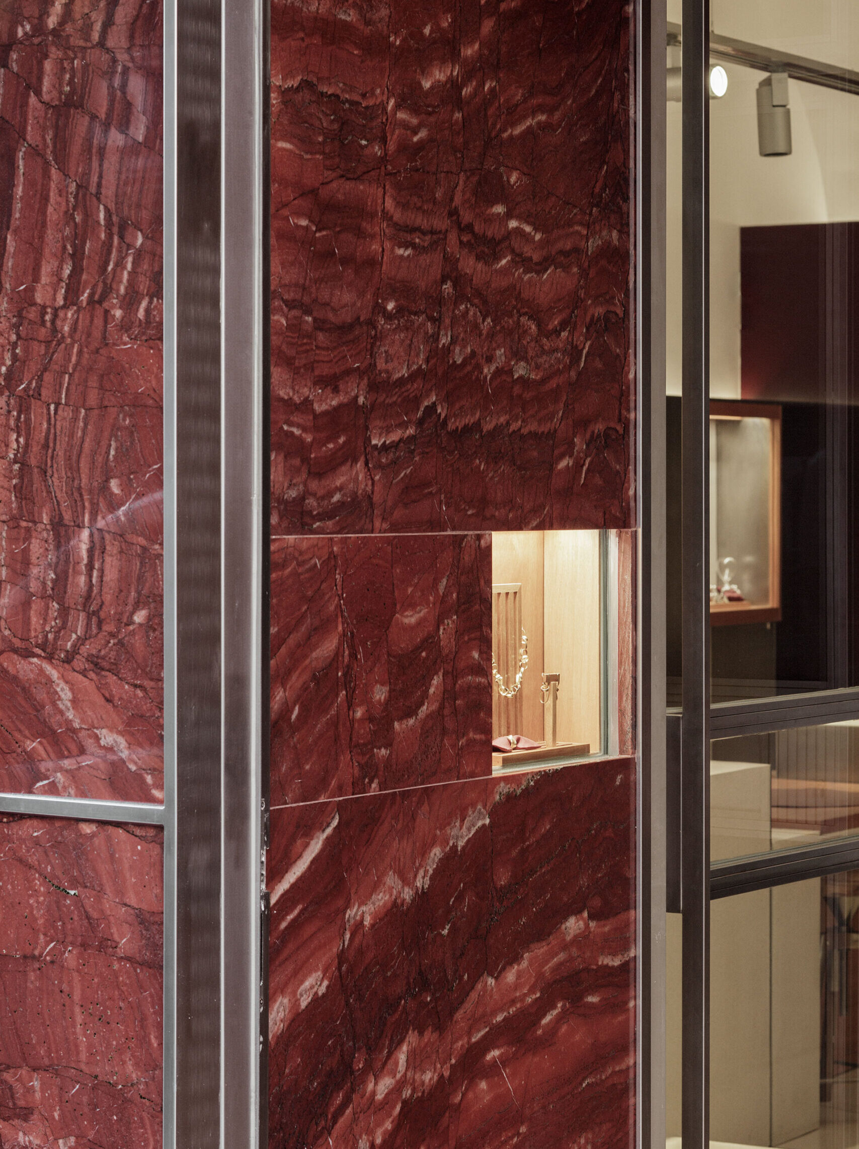 Our work on the heritage-listed façade involved recovering the details and colours that had disappeared over time. We clad the ground floor of the building with Kalahari granite –matching the brand’s colour– framed with a stainless-steel structure that extends into the interior of the jewellery shop. Cast-in-place terrazzo was used for the floor and the main counter, unifying both elements. The warmness of the cedar wood contrasts with the hardness of the stainless steel and terrazzo.