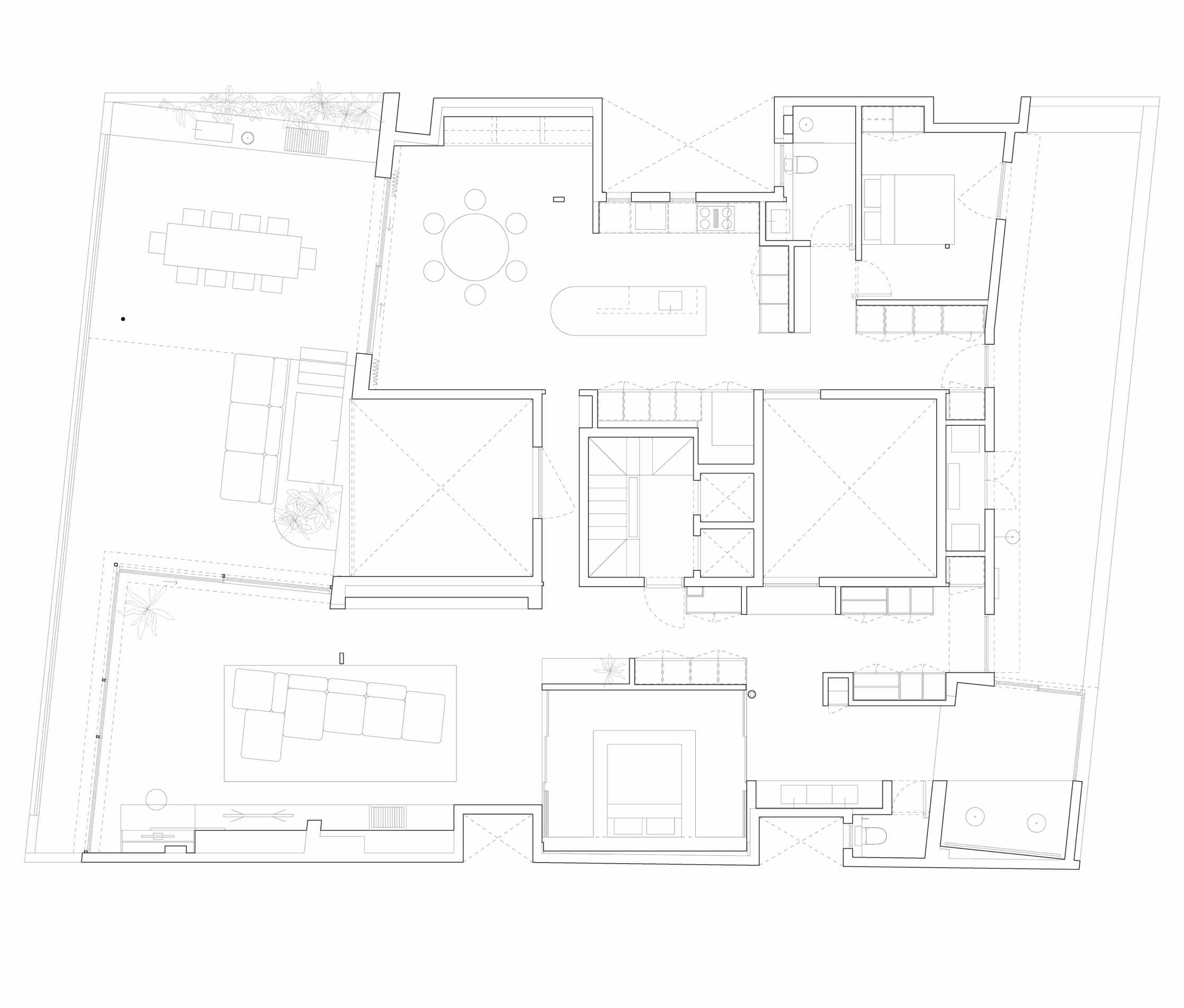 With 190 m² of interior space and almost 100 m² of terraces at both ends, the flat could have been organised in many ways. As it is a home for two people, privacy was not a primary concern, which allowed for a more open layout focused on shared spaces and the continuity between different areas of the house.