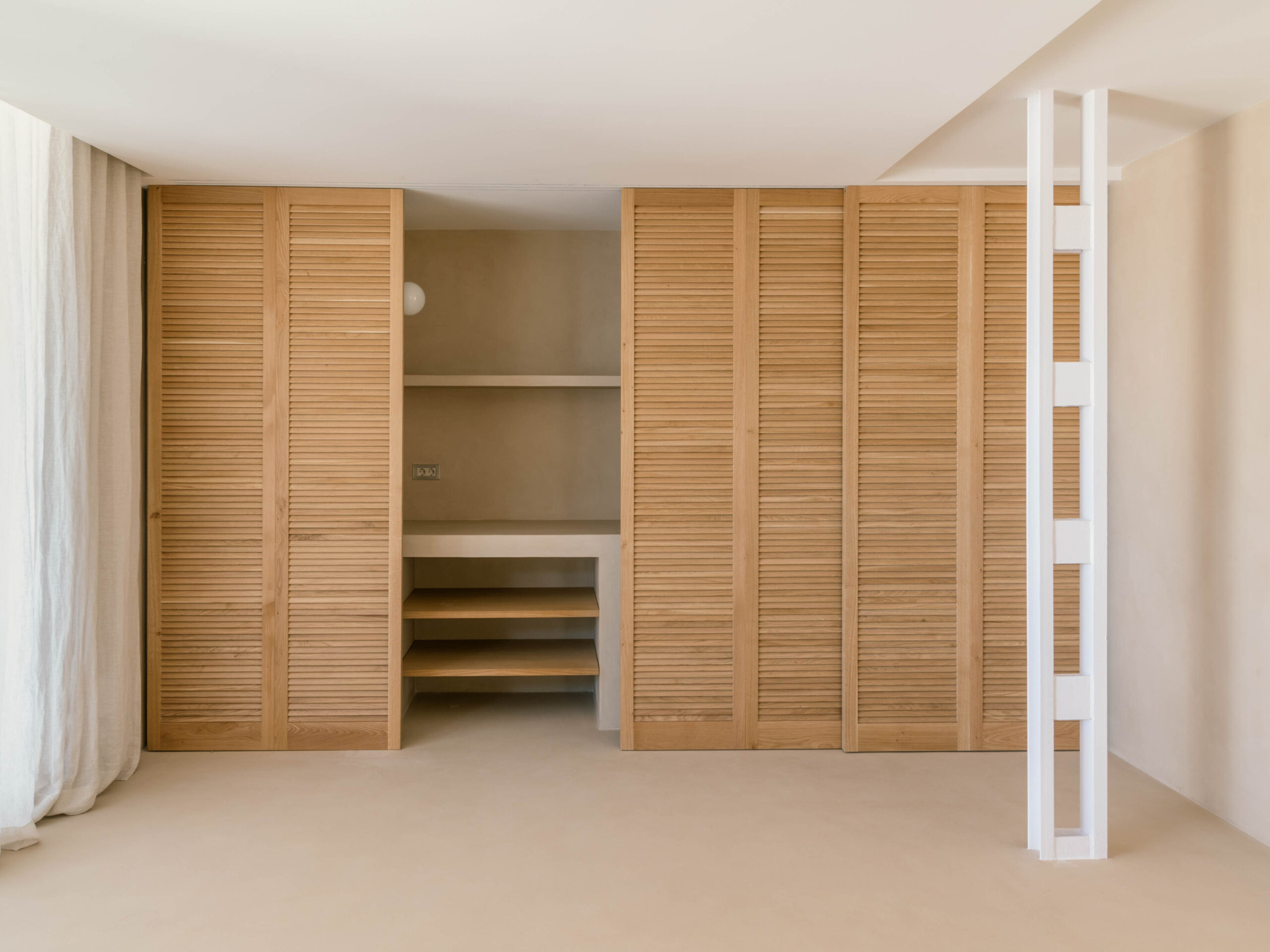 The floorplan is organised along a north–south axis: the bedrooms and bathrooms sit to the east, while the kitchen, dining area, and living room open onto the large west-facing terrace and the views. The main bedroom is conceived as a minimal and flexible unit, defined by wood sliding panels at both ends that connect the space either to the living area or to the bathroom and dressing area, which form a single open space.