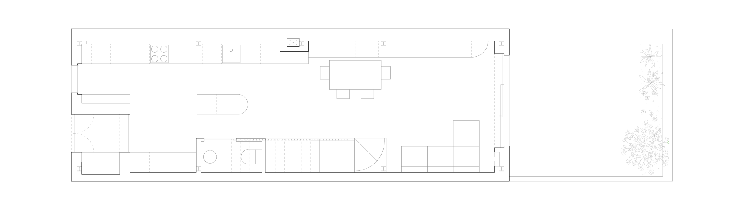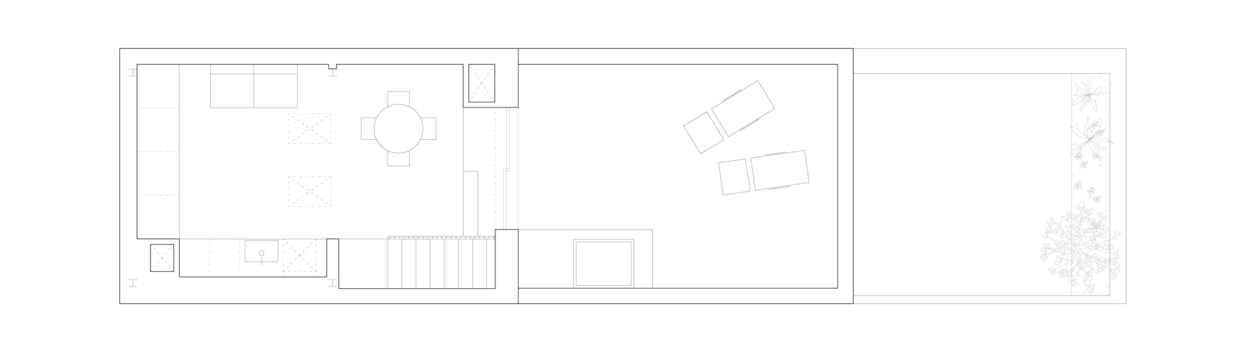 We distributed the program across the three levels, leaving the common areas on the lower ground floor and the private ones on the other two. The ground floor is conceived as a transitional space between street and patio, with an open kitchen designed as a flexible area. Both the façade and the interior and exterior floors are finished with rectangular beige terracotta tiles, establishing a material continuity that unifies the different spaces.