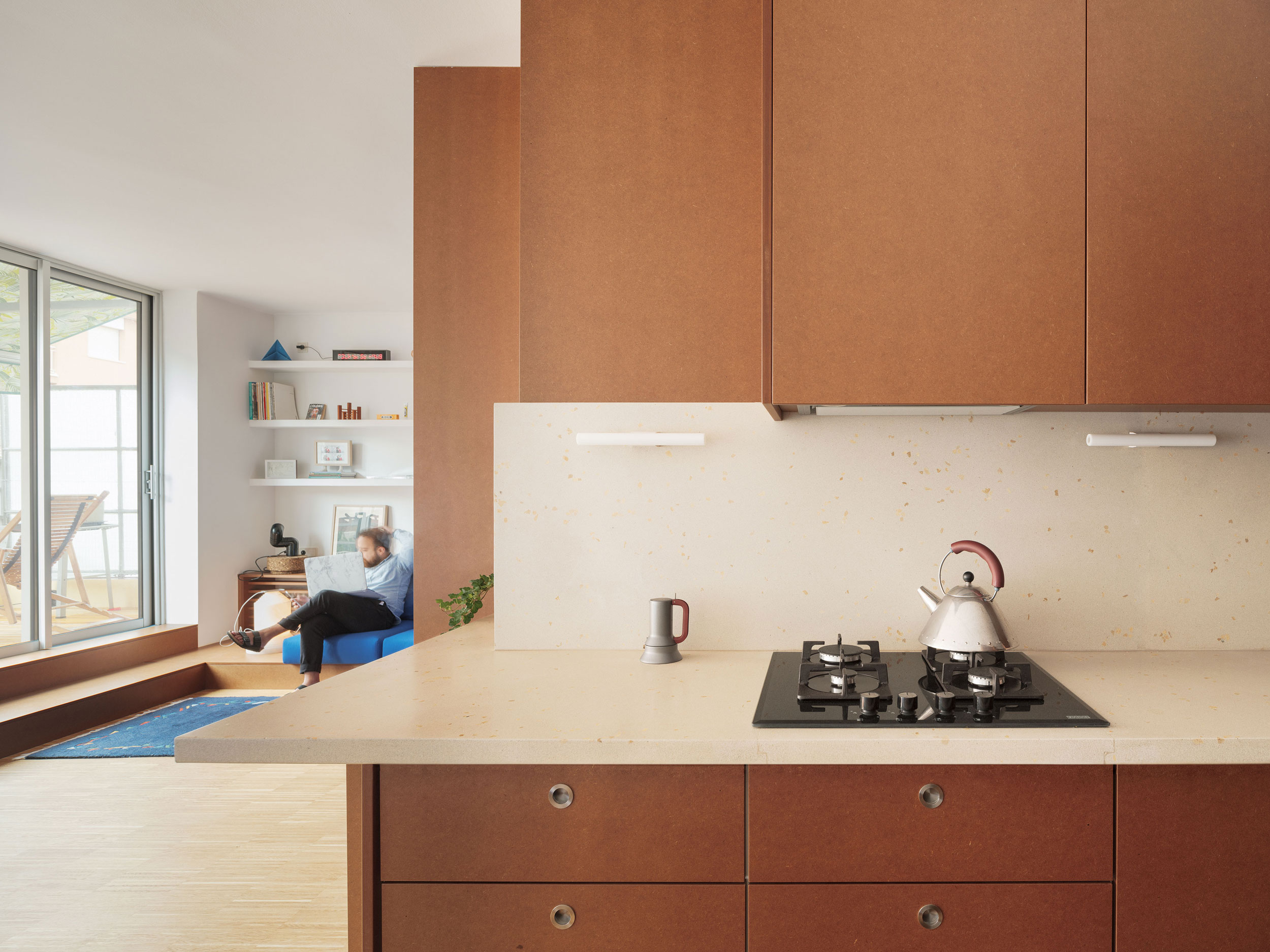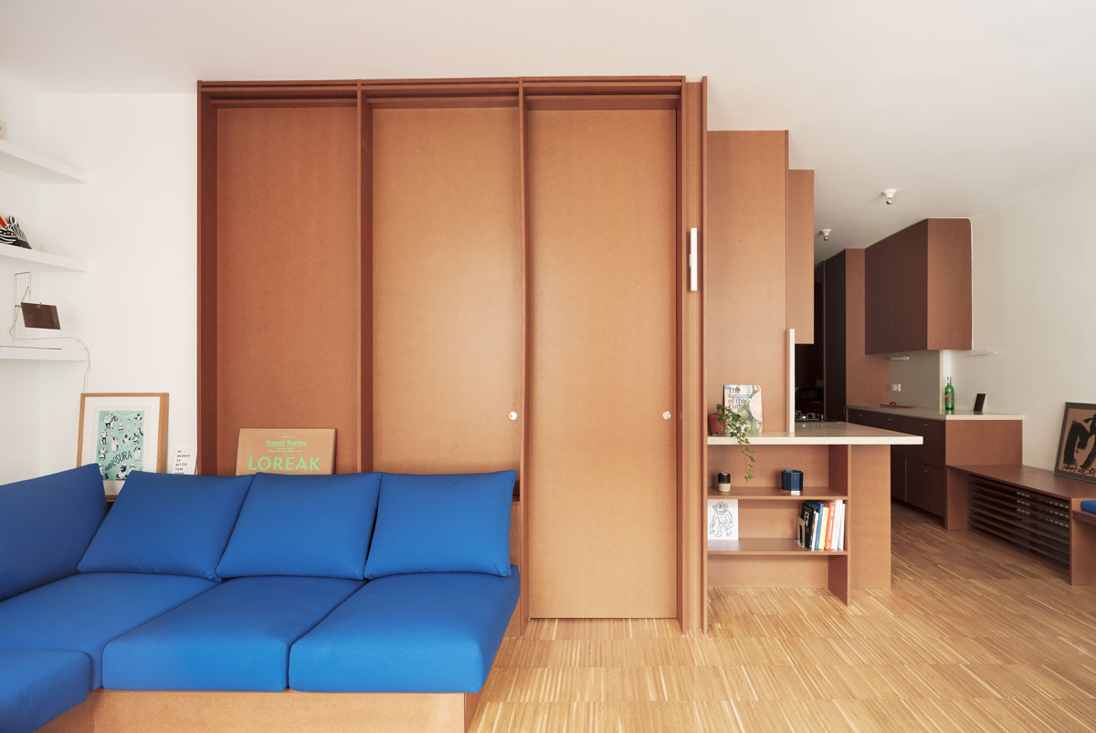 We reimagined the hallway as a multifunctional space, integrating storage solutions and practical features. A custom-built 60 cm deep unit along the neighbor’s wall serves multiple functions, from a cupboard to a kitchen counter and dressing table. On the opposite side, a row of shelving subtly separates the private and common spaces, flowing seamlessly into the kitchen and living room.