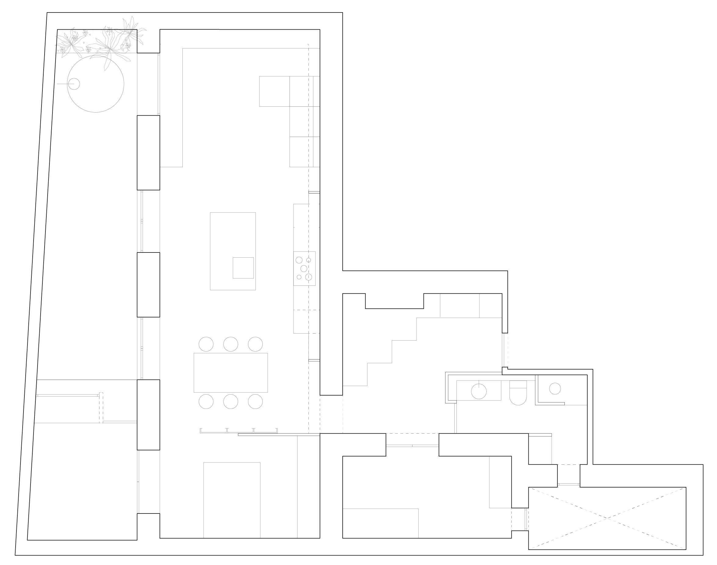 We organized the bathroom and study around the secondary courtyard next to the entrance. The most expressive intervention is at the entrance, where we designed a stair-like storage that takes advantage of the unusual existing corner.